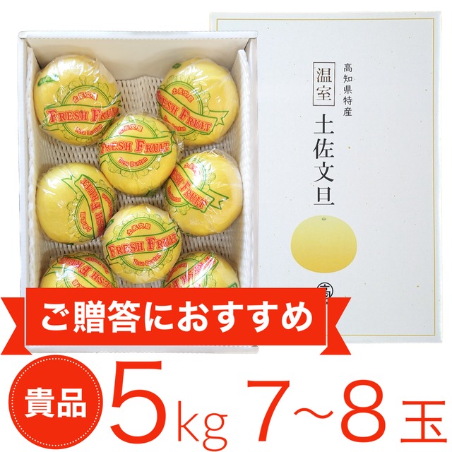 【温室文旦】5kg貴品(7~8玉) 1玉600-700gほどの大玉をお届けします。7玉か8玉かはお選びいただけませんのでご了承ください。 貴品について… ビニールハウスで大切に育てた温室文旦の中でも特に見た目に美しいものを選別し、一つ一つ手作業でセロハン紙で個装して箱にお詰めしています。見た目が非常に美しいため、特別な方へのご贈答にオススメです。 温室文旦について… 通常、露地栽培する土佐文旦をビニールハウスの中で栽培した爽やかで甘酸っぱいフルーツです。天候の影響を受けにくいため安定した品質で露地栽培に比べ見た目も美しく、高い糖度と上品な味わいが特徴で高級フルーツとされています。 出荷時期が11月下旬〜12月下旬ごろなので、お歳暮用として毎年多くの方に喜んで頂いております。 ●全国送料無料でお届けします。(沖縄・北海道は別途500円頂戴します。) ●ご注文から7〜10日前後でお届けします。日時指定も承ります。 ● お熨斗対応、承っております。 備考欄にてご要望ください。 ●お届け日より2週間以内を目処にお召し上がりください。ラップに包むかビニール袋に入れて冷暗所で保管していただくと、より長く美味しくお召し上がりいただけます。 ●食べ方のしおりをおつけしてお届けします。